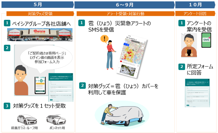 今年度は、降雹被害が多い6月~10月に向けて、雹災が頻発した群馬県を対象に「降雹対策グッズ」を活用した実効性の高い回避行動を検証する。ベイシアグループでは地域住民の実回避行動につながる対策グッズの開発・配布を担う。対策グッズを配布するのは、高崎、前橋、伊勢崎エリアに居住する三井住友海上の自動車保険契約者(個人)が対象だ