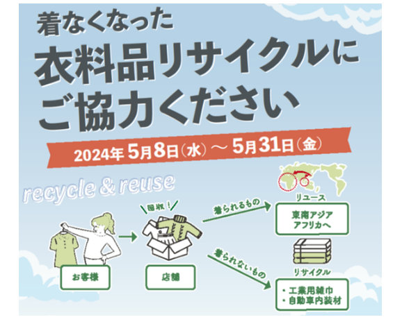 (株)ライフコーポレーション(東京本社:東京都品川区、大阪本社:大阪市淀川区、岩崎高治社長)は5月8日(水)から5月31日(金)まで、近畿圏15店舗で「着る機会がなくなった衣料品の回収」を実施する。