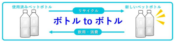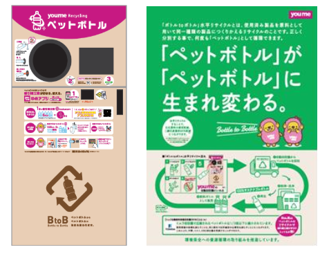 「ボトル to ボトル」は、使用済みペットボトルを店頭で回収し、新たなペットボトルに生まれ変わらせる水平リサイクルの取り組みである。きれいに分別することで、何度も「ペットボトル」として資源を循環させることができる。また、ペットボトルと同時にアルミ缶回収機も設置してリサイクルする。