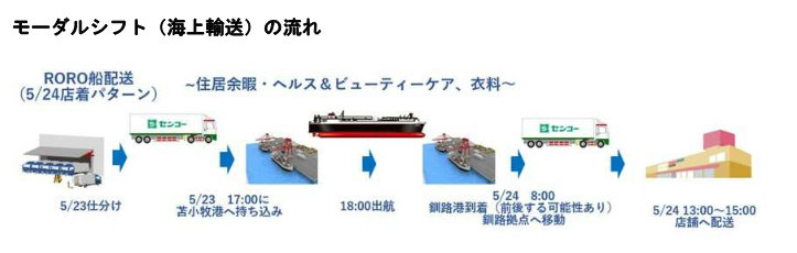 イオン北海道(株)(札幌市白石区、青栁英樹社長)は栗林商船(株)(東京都、 栗林宏社長)と連携し、5月24日(金)と25日(土)に「イオン釧路店」と「イオン釧路昭和店」に納品する衣料品の一部を、栗林商船のRORO定期船(苫小牧港発、釧路港着)による海上輸送の実証実験を実施する。