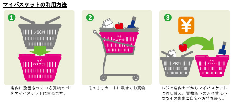 イオンでは、使い捨てプラスチック削減に向けた買物袋持参運動の一環として、マイバスケットの展開を、全国のスーパーマーケットでは先駆けとなる2000年に開始している。