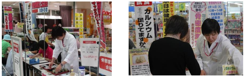 健康キャンペーンは、顧客が自身の健康について意識を高めてもらうための取り組みで、地域住民の健康保持・増進を目的として、各自治体と協力しながら開催している。開催当日は、①はかって当てよう1日分の野菜350g、②血管年齢測定、③骨密度測定、④乳がんモデル触診体験、⑤健康メニュー提案を行う。