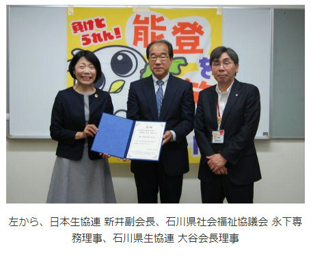 会員生協を通じて日本生協連に寄せられた募金は、義援金(被災した方に直接配分)と支援金(被災地への支援活動のための費用)として被害の大きかった自治体や被災者支援活動を行う団体等で活用される。このうち300万円を支援金として石川県社会福祉協議会に贈呈する。