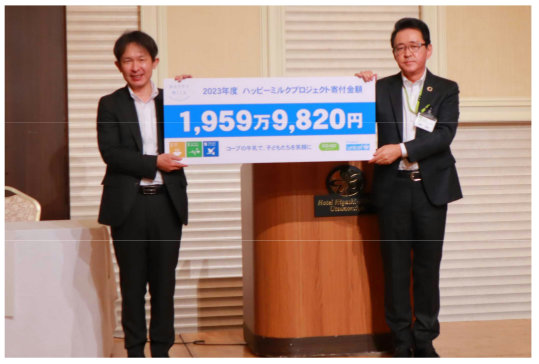2023年度に購入された牛乳7283万9803本分の売り上げの一部と、コープデリ宅配を通じて寄せられた募金を合わせた計1959万9820円の目録を、日本ユニセフ協会へ贈呈した。