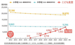 むすびえ、および地域ネットワーク団体が実施する「子ども食堂全国箇所数調査」によると、 2023年度、全国の子ども食堂は前年度(22年度)と比較して1769カ所増え、9132カ所となり、全国の公立中学校と義務教育学校の数を合わせた9296カ所とほぼ並ぶ結果となっている。