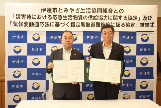 みやぎ生活協同組合(宮城県仙台市、冬木勝仁理事長)とコープふくしまは、福島県伊達市と「災害時における応急生活物資の供給協力に関する協定」「気候変動適応法に基づく指定暑熱避難施設に係る協定」を締結した。