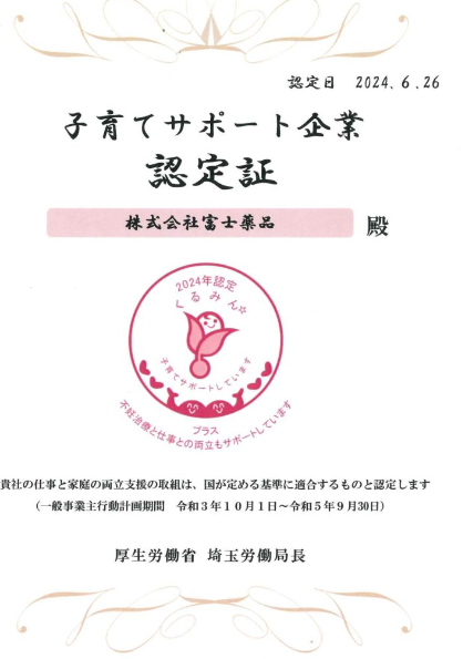 (株)富士薬品(埼玉県さいたま市、高柳昌幸社長)は、厚生労働省埼玉労働局より「くるみんプラス」に認定された。子育てサポートに加え、従業員の不妊治療と仕事との両立をサポートする企業として、評価されたもの。