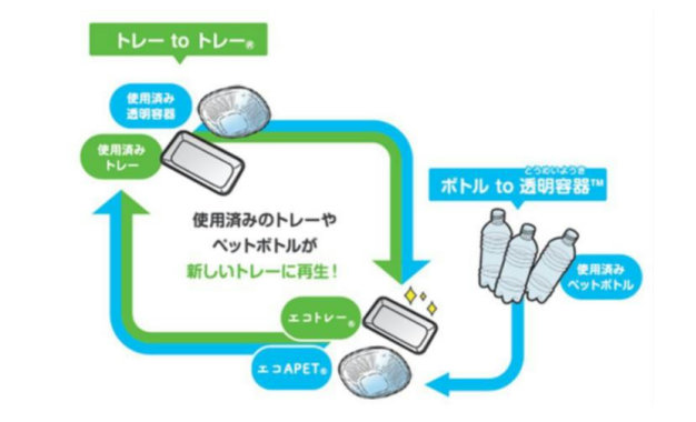 「トレーto トレー」とは、店頭で回収された使用済み食品トレーを新たな食品トレーに生まれ変わらせることの名称、また「ボトル to 透明容器」は、使用済みペットボトルを回収し新たな透明容器に生まれ変わらせる、エフピコ方式のリサイクルの名称を指す。