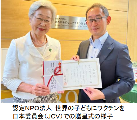 (株)マルエツ(東京都豊島区、本間正治社長)は7月31日(水)、2023年度に回収したペットボトルキャップの売却益138万2160円を「認定NPO法人 世界の子どもにワクチンを 日本委員会(JCV)」へ寄付した。