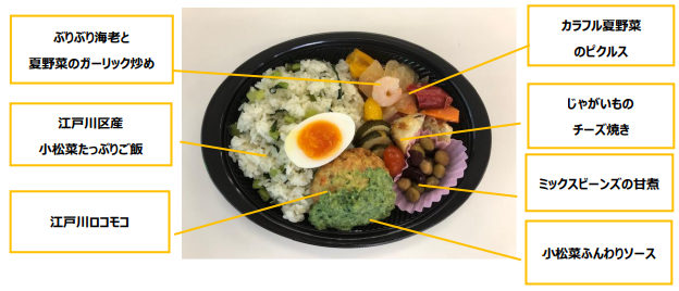 イトーヨーカ堂も交えた試⾷・評価会を経て、2024 年 5月に商品開発が完了し発売が 決定した。弁当はは江戸川区の姉妹都市であるハワイ州ホノルル発祥のメニュー「ロコモコ」をベースに、主⾷・主菜・副菜料理を3・1・2の割合に詰める「3・1・2 弁当箱法」となっている。、ロコモコソースには江戸川区産の小松菜を使⽤している。価格は698円(本体)