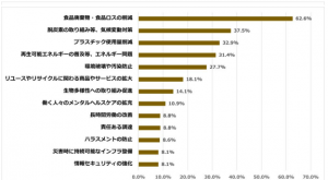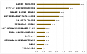 「食品廃棄物・食品ロスの削減」は昨年同様に最も多く64.2%だった。「プラスチック、紙などの容器の包装材の削減」も2番目に選ばれ、廃棄物抑制への重点度が高い結果となった。毎年上位に選ばれている「商品の品質・安全の確保・正確な表示」も34.4%、CO2の削減、リユース・リサイクルの推進、包装材削減など、環境課題への意識も高くなっている。