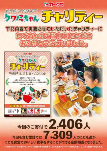 流通スーパーニュース > CSR > オークワnews|PB売上げの一部をこども食堂支援に寄付 オークワnews|PB売上げの一部をこども食堂支援に寄付 CSR / 2024年08月29日 ツイート (株)オークワ(和歌山県、大桑弘嗣社長)はオリジナル商品(オークワプレミアム、オークワマルシェ、オークワセレクト、O-SOZAI)の売上げの一部を出店地域8府県のこども食堂ネットワーク団体を通じ、こども食堂の支援活動に寄付を行った。 2406人相当のこどもがこども食堂を利用できる金額。「クワノミちゃんチャリティ」と題したチャリティ企画で6月21日から7月20日の1カ月間、全店で実施した。 ツイート
