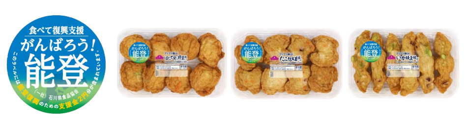 イオンは石川県食品協会の取り組みに賛同し、令和6年能登半島地震で被災し製造を再開した石川県内の工場で製造する「トップバリュ」商品3品目に「がんばろう!能登」シールを貼付し発売する。イオントップバリュ(株)は、石川県食品協会からシールを1枚3円で購入し、そのうち原材料費(紙代及び印刷費等)を除いた2円が、石川県食品協会を通じて、能登の食品関連企業の支援や能登の食文化を守るための取り組みに活用される仕組みだ。