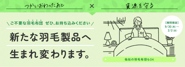 (株)ニトリホールディングス(札幌市北区、⽩井俊之社長)は9⽉30⽇(⽉)〜2025年2⽉2⽇(⽇)の約4カ月間の期間限定で、ニトリ・ニトリEXPRESS・デコホーム・島忠・島忠ホームズ・ニトリホームズ全店舗(N+は除く)で、顧客が不要となった⽻⽑布団の回収を実施する。