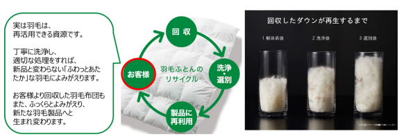 ⽻⽑布団はダウン率50%以上であれば、販売元や汚れの有無、使用年数にかかわらず店頭で回収する。回収した布団は解体して取り出した⽻⽑を丁寧に洗浄し、再製品化に取り組む。