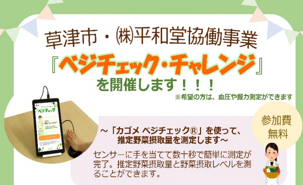 平和堂と草津市は、顧客・地域の生活者の健康増進をサポートするため、2022年より草津市内の平和堂店舗で、「ベジチェック」を使用した野菜摂取啓発活動として「ベジチェック・チャレンジ」を協働で開催している。