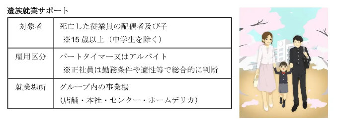 「遺族就業サポート」は、亡くなった従業員の配偶者や子がベルクグループでの就業を希望する場合、可能な限り支援を行う。居住地や就業希望条件を考慮し、店舗やセンター等、グループ内の事業場での就業が可能となるよう支援を実施する。