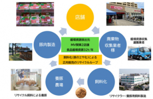 東京都江戸川区の「マックスバリュエクスプレス 船堀駅前店」、「マックスバリュエクスプレス 松島店」で分別した食品循環資源を、収集運搬業者((株)要興業)が運搬し、再生利用事業者((株)アルフォ)に搬入して飼料化する。養豚場((有)アリタホックサイエンス)ではその配合飼料を給餌し育てた豚を(株)恋する豚研究所を通じて正肉化し、上記マックスバリュ店舗で販売する。