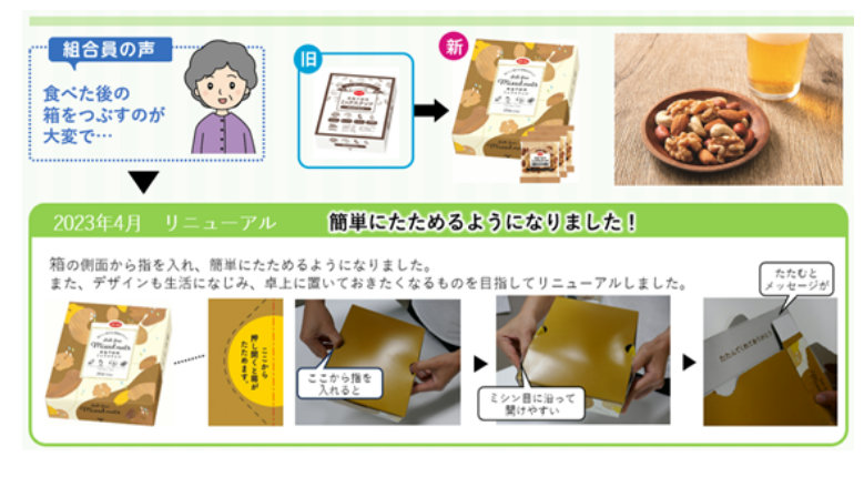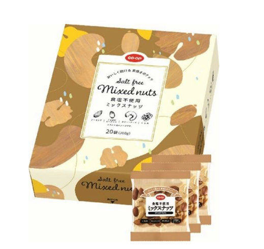 「CO・OP食塩不使用ミックスナッツ20袋(360g)」は、紙箱に個包装が20袋入った商品だが、組合員からの「食べた後に箱をつぶすのが大変」という要望から、包装設計とパッケージデザインの変更を行った。