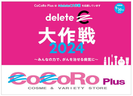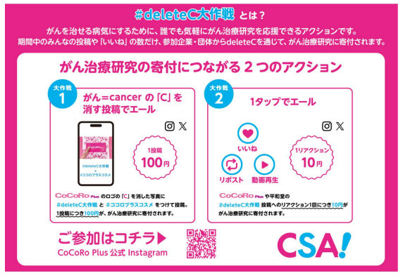 平和堂では、平和堂が運営するコスメ&バラエティショップ「CoCoRoPlus」のロゴの「C」を消した画像や動画に「#deleteC 大作戦」と「#ココロプラスコスメ」をつけてSNSに投稿・拡散すると、1投稿あたり100円ががん治療研究に寄付される。