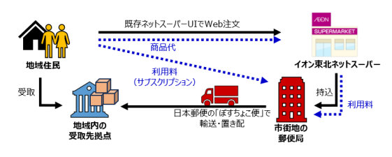 対象者は、日本郵便Webサイトの「おたがいマーケット」会員。「イオン東北ネットスーパー」のWebサイトから商品を注文すると、受取先拠点の「山辺町役場 作谷沢支所」に荷物が届く。