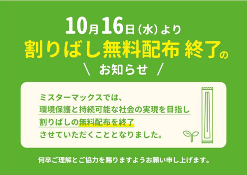ミスターマックスグループは持続可能な社会の実現を目的としたサステナビリティ活動の一環として、ゴミ廃棄量や、CO2 排出量を削減する取り組みを行っている。割りばしの無料配布終了は、環境保護に貢献することを目的としている。