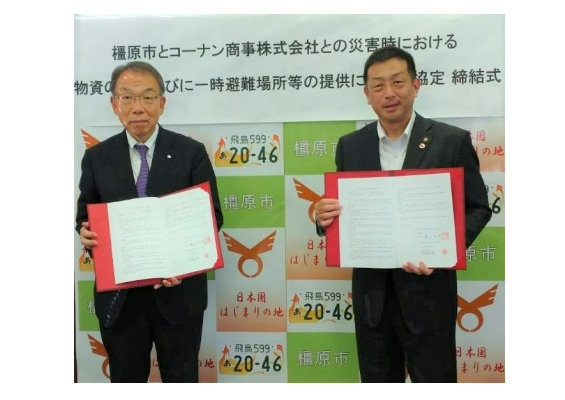 コーナン商事(株)(大阪市淀川区、疋田直太郎社長)は10月1日(火)、奈良県橿原市(亀田忠彦市長)と「災害時における物資の供給に関する協定」および「災害時における一時避難場所等の提供に関する協定書」を締結した。