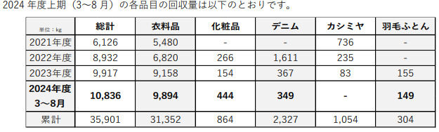 (株)高島屋(大阪市中央区、村田善郎社長)は2024年度上期(3月~8月)の不用品の回収実績を発表した。衣料品など合わせて 1万kgを超える回収量となり、2023年度の回収量を上回った。これまでの累計でも約3万6000kgとなった。