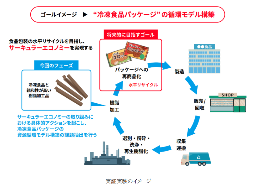 4社は共同実証をもとに、消費者、行政、企業の連携による冷凍食品包装(フィルム)の分別回収・リサイクルの仕組み構築を目指し、中長期的には業界全体を巻き込みながら実証範囲を拡大していくことで、冷凍食品包装(フィルム)の資源循環モデルを構築し、社会実装を目指す。