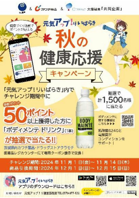 キャンペーンの内容は、チャレンジ期間中に歩いてポイントを貯め、抽選に応募。商品引換期間内に茨城県内のカワチ薬品70店舗、もしくはドラッグストアクラモチ8店舗で専用クーポンを提示した当選者1500名に、大塚製薬の「ボディメンテ ドリンク」をプレゼントする。