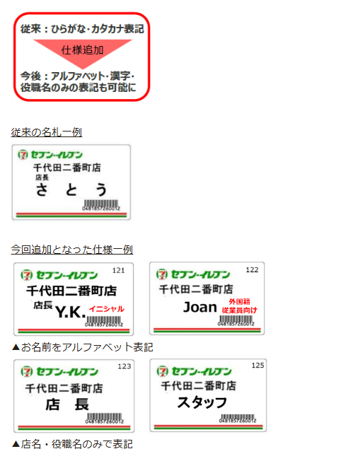 「従業員名札の仕様追加」は加盟店からの注文に応じて、10月27日(日)以降、随時納品している。