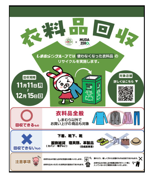 (株)しまむら(埼玉県さいたま市、鈴木誠社長)は 11月11日(月)から12月15日(日)まで、しまむらグループ200店舗で衣料品回収を実施する。