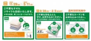 また、タオル回収に加え、9月30日(月)~2月2日(日)の期間限定で羽毛布団のリサイクル回収、通年でカーテンのリサイクル回収を実施している。タオル、羽毛布団、カーテンすべて他社製品も持ち込み可能だ。