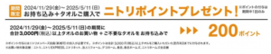 期間中に不要になったタオルを持ち込み、新たに合計3000円(税込み)以上タオルを購入すると、ニトリポイントが200ポイント付与される。