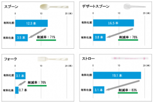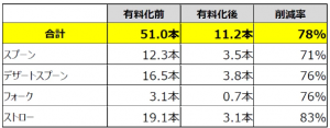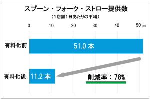 有料化を実施した結果、対象店舗の1店舗1日当たりのスプーン・フォーク・ストローの合計提供本数は、有料化前と比較して51.0本から11.2本(▲39.8本、約78%削減)に削減された。プラスチックの使用重量は100.5gから23.1g(▲77.4g、約77%削減)に削減された。