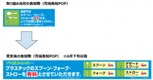 有料化した当初は、「有料」であることを主に伝える告知物を掲示していたが、取り組みの目的などをより理解してもらえるように、6月下旬から告知物の表示に、有料対象アイテムのそれぞれの価格と、有料化の目的が環境保護を目的とした「プラスチックの削減」にあることを説明する表現を追加した。これにより顧客の有料化に対する認知がより向上することが確認できた。