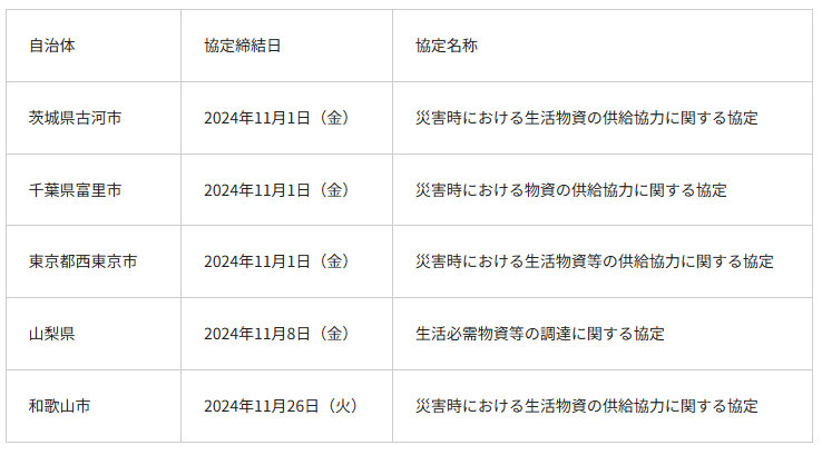 (株)カインズ(埼玉県本庄市、高家正行社長CEO)は、11月1日(金)に茨城県古河市、千葉県富里市、東京都西東京市と、11月8日(金)に山梨県と、11月26日(火)に和歌山市と、それぞれ災害時における物資供給等に関する協定を締結した。