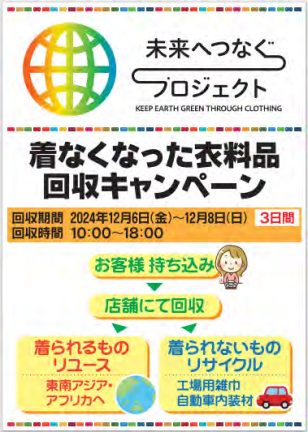 衣料品は、和歌山県内の「スーパーセンターパームシティ和歌山店」「パビリオンシティ田辺店」「ロマンシティ御坊店」と大阪府の「わくわくシティ尾崎店」の4店舗に設置する「衣料品回収特設コーナー」で集める。