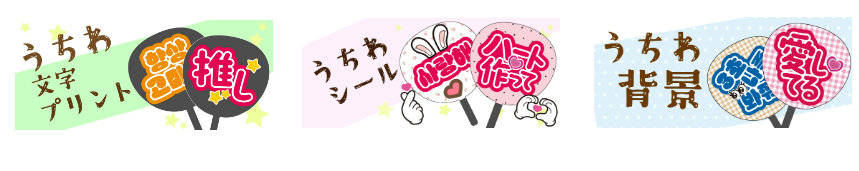 「うちわ文字プリント」は税込価格で300円(以下同)、「うちわシール」はL判:250円、2L判:500円、「うちわ背景」は300円。