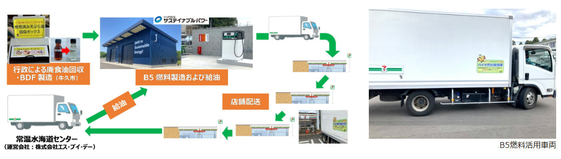 牛久市と近隣9自治体とが連携して、学校給食や一般家庭、民間事業者などから回収した廃食油から製造された「B5」を、水海道市内の共同配送センターから出発する配送トラックに給油して店舗配送を行うスキームとなる。