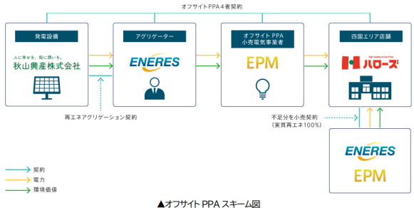 不動産事業を展開する秋山興産が香川県内に保有する非FIT太陽光発電所で生じた再生可能エネルギー(再エネ)を、エナリスおよび子会社で小売電気事業者のエナリス・パワー・マーケティング(EPM)を介して、ハローズが運営する四国エリアのスーパーマーケット11店舗に供給する。