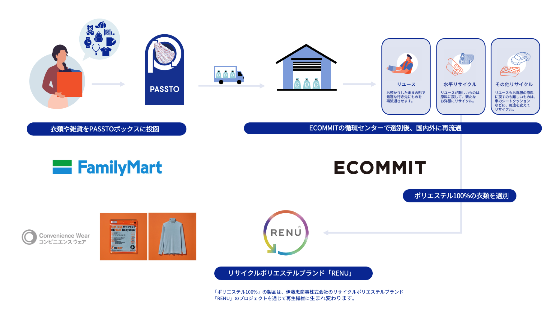 また回収された衣類の一部(ポリエステル100%の衣類)は、伊藤忠商事(株)が展開するリサイクルポリエステルブランド「RENU」のプロジェクトを通じて、再生繊維(再生ポリエステル)に生まれ変わる。ファミリーマートのオリジナルアパレルブランド「コンビニエンスウェア」の一部商品では、この「RENU」の再生ポリエステル糸を使用している。