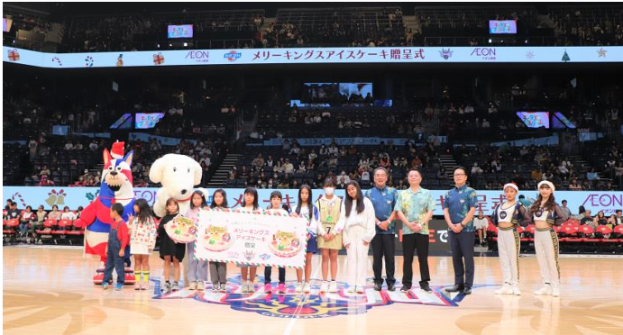 寄付に先立ち12月14日(土)には琉球ゴールデンキングスのホームゲームに子どもたち100名を招待し、プレゼントするアイスケーキの目録を贈呈した。