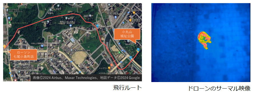 この実証では、石川県七尾市の「七尾警察署」からAI制御で障害物を自動回避しながら安全に自律飛行が可能なドローン「Skydio X10」を、「ローソン七尾小島町店」から行方不明者の捜索現場や交通事故現場と見立てた場所まで飛行。現場到着後、AIドローンのサーマルカメラや高精度カメラ映像を通じて、石川県警察とKDDIが連携し、遠隔で現場確認までの初動対応を行い、警察活動への活用の可能性を確認した。