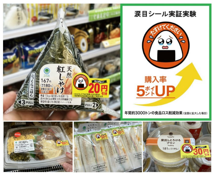 ファミリーマートは、10月30日(水)から11月26日(火)までの4週間、東京都と神奈川県の一部店舗で実証実験を実施。値下げシールに涙目の表情をしたおむすびのイラストと「たすけてください」のメッセージを掲載し、行動心理学的に顧客の食品ロスに対する意識や感情に訴えた。