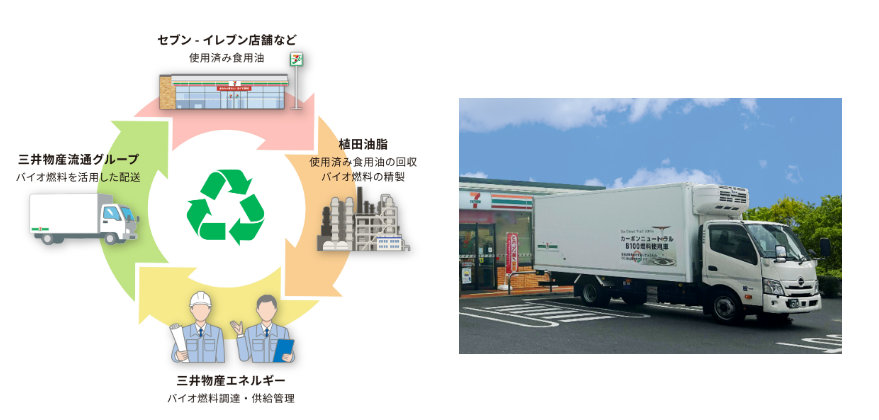 今回、大阪府や京都府などのセブン‐イレブン約1500店舗などから回収した使用済み食用油から高純度のB100燃料を精製。フローズン神戸センターの配送車両に給油して、大阪方面のセブン‐イレブン店舗へ配送を行う。バイオ燃料の調達・供給管理は三井物産の100%子会社が担う。