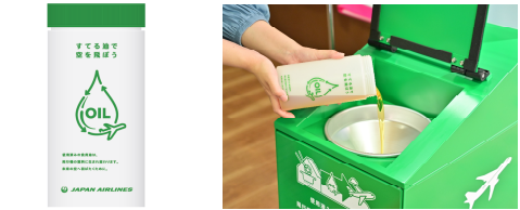 顧客には家庭で集めた廃食油を「JALオリジナルUCOボトル」に入れ、回収ボックスに直接流し込んでもらう。