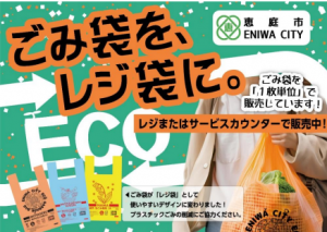 恵庭市は、プラスチックごみ削減の推進を目的として、令和6年度に恵庭市が製造し納品する有料指定ごみ袋を、レジ袋として持ち帰りに抵抗がないデザインに変更した。
