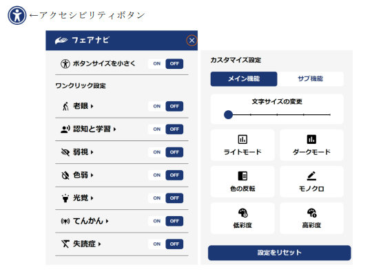 「フェアナビ」は、ウェブサイトの右上に配置したアクセシビリティボタンから簡単に文字サイズの変更や老眼、弱視、色弱、光覚、てんかん、失読症など、個々の特性によって自由にウェブサイトの見え方を変更できるサービス。誰もが平等にウェブサイトを利用できる社会を目指して開発された。