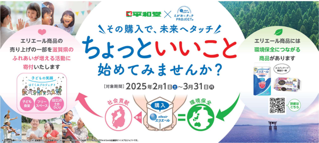 (株)平和堂(滋賀県彦根市、平松正嗣社長CEO)は2月1日(土)から、大王製紙(株)が実施する「エリエール えがおにタッチ PROJECT」に賛同し、エリエールブランド商品の売上げの一部を環境保全や社会貢献活動に寄附する「ちょっといいことキャンペーン」を開催している。